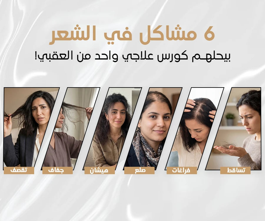 مجموعة علاج متكاملة من صيدليات العقبي تعالج تساقط الشعر من الجذور وتعيد كثافته وقوته خلال 3 شهور، ومعها روتين بديل البروتين الطبيعي هدية لشهر كامل لعلاج الجفاف والهيشان والتقصف. برنامج واحد يعالج 10 مشاكل شعر في نفس الوقت ويحوّل شعرك من ضعيف ومتساقط لشعر صحي، ناعم، وكثيف بمظهر طبيعي وآمن.