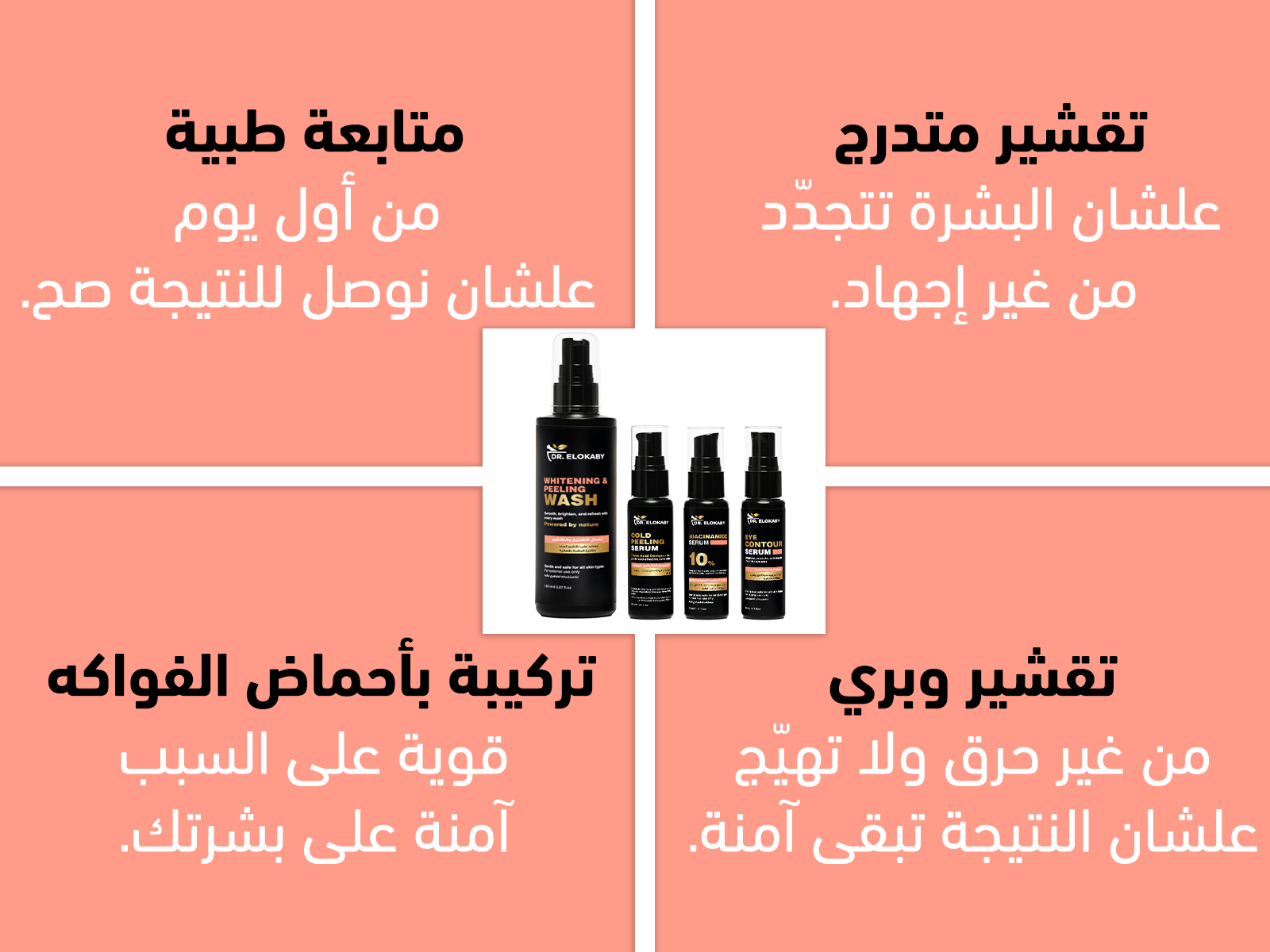 تعتمد المجموعة على أحماض فواكه بتركيزات مدروسة تساعد على إزالة الخلايا الميتة تدريجيًا، تقليل التصبغات والكلف، وتحفيز تجديد خلايا البشرة دون التعرض لمخاطر التقشير القوي أو الحرق.